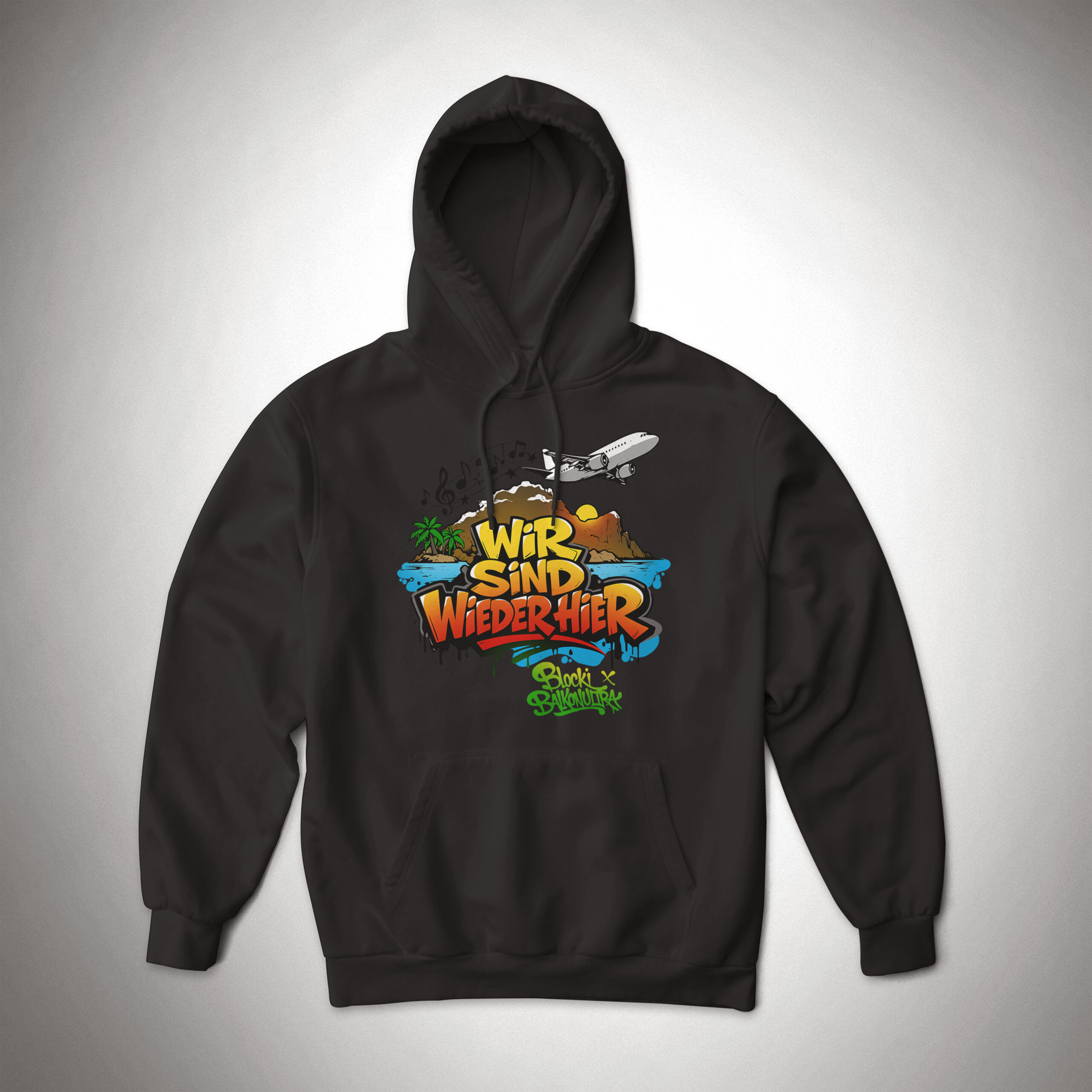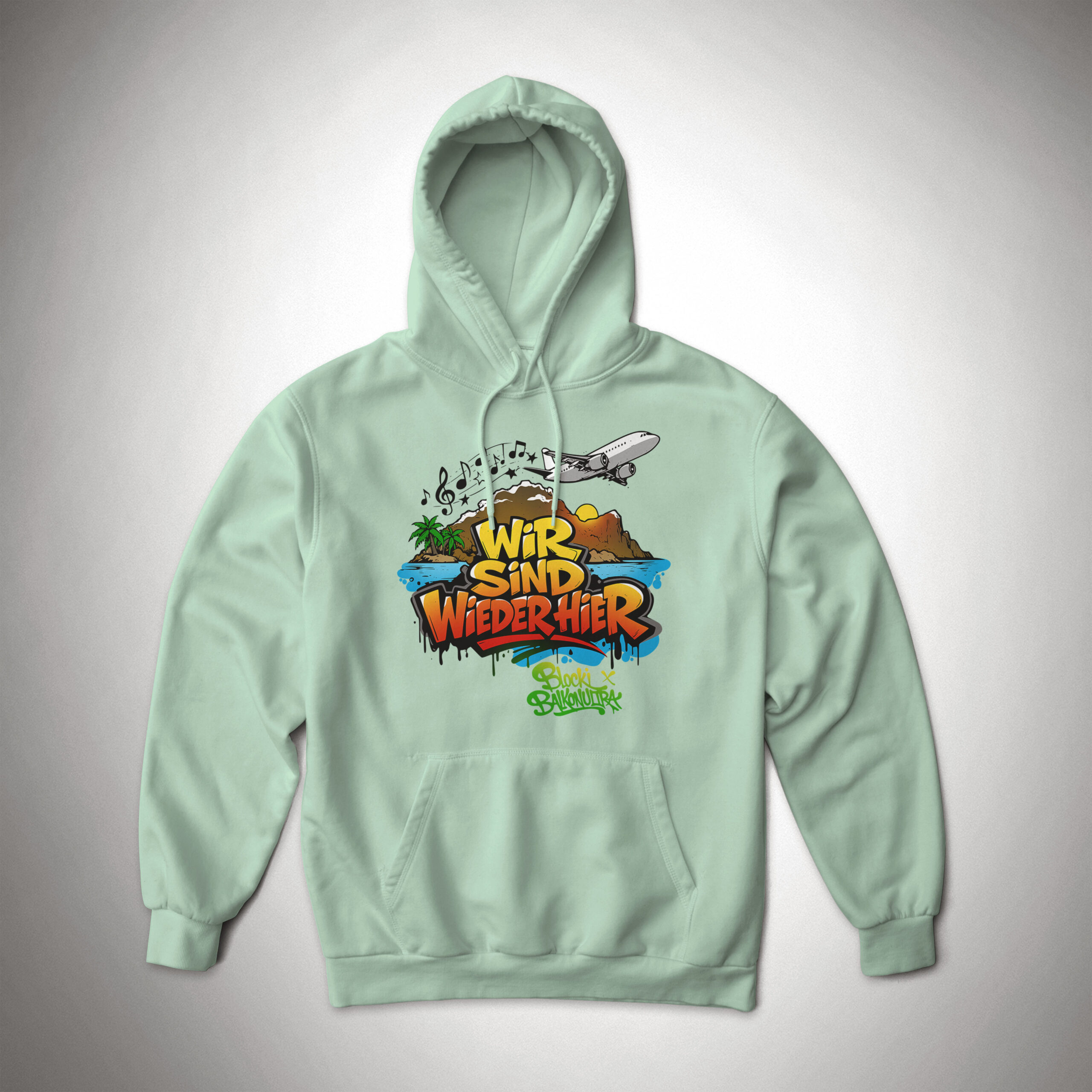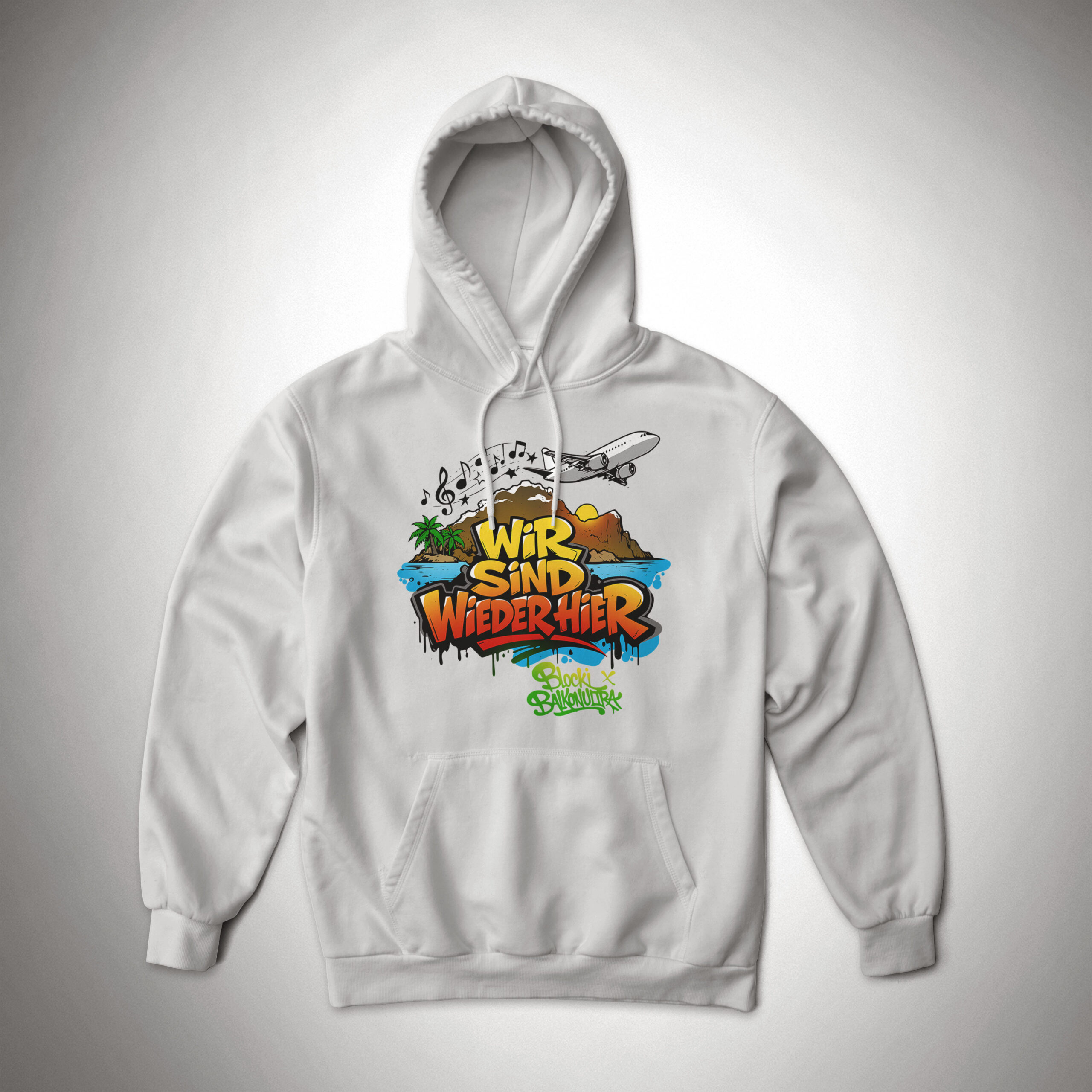 Dieser Hoodie wird mit dem Blocki Motiv ‚wir sind wieder hier‘ bedruckt und ist für Frauen sowie für Männer. Das Motiv hat eine Breite von ca. 33 cm und befindet sich im Brustbereich.