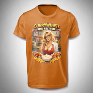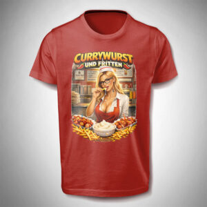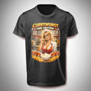 Dieses Shirt wird mit dem Currywurst und Fritten Motiv bedruckt und ist für Frauen sowie für Männer. Das Motiv befindet sich im Brustbereich.